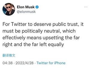 凤凰网科技讯 北京时间4月28日消息,当地时间4月27日,马斯克在推特发文称“推特要想获得公众信任,就必须保持政治中立的,这实际上意味着对极右翼和极左翼势力的影响是同样的。”