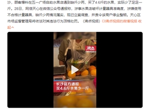 五一旅游遇到商家缺斤短两就非常影响体验了,沸点视频报道称,有游客在长沙花费115元买了4.6斤水果,结果少了一斤,现在官方调查结果也出来了,情况属实。网信天心在微信公众号通报称,涉事水果店破坏计量器具准确度,涉嫌使用不合格计量器具,缺斤少两情况属实,现已立案调查,并责令该商户停业整顿。最近有关旅游景点缺斤少两及价格争议的新闻很多,大家五一出行还是要谨慎一点,问清楚再说。