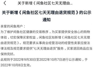 10月8日起实行 闲鱼卖家需提供7天无理由退货服务