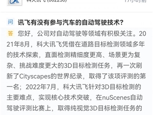 科大讯飞在回答投资者提问时表示,公司对自动驾驶等领域有积极关注...科大讯飞表示,公司的智能驾驶科技总部于6月份落户江苏省无锡市,相关产研工作有序开展中...