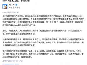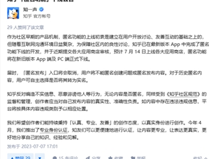 7月初,知乎官方宣布将下线匿名功能”,知乎表示,作为社区早期的产品机制,匿名功能的上线初衷是建立在用户开放讨论、友善互动的基础之上的。知乎创始人、CEO周源回应称,匿名功能这个事,我们就既往不恋了,让我们用更专业真实的身份去讨论、去分享、去发现,要重心向前。知乎官方强调,知乎反对编造不实信息、恶意诽谤他人等行为,无论内容是否匿名,同样受到《知乎社区规范》的监督和管理,创作者应当对自己发布内容的真实性、准确性负责。