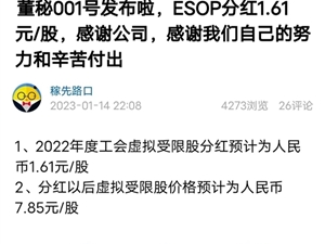 华为内部公布了最新的分红数据 ,2022年度工会虚拟受限股分红预计为人民币1.61元/股,较去年1.58 元/股有所增长,分红以后虚拟受限股价格预计为人民币7.85元/股。分红最高的当属2010年,每股分红为2.98元,分红最低为2017年,每股分红1.02元。这种分红对于华为员工来说意义很大,因为这占了大部分人的收入。能够在非常艰难的外部环境压力下给出这样的方案,显然超出不少员工的预期,多条评论表达了类似的意思并表示感谢公司,感谢老板”。据悉,华为是一家100%由员工持有的民营企业,没有任何政府部门、机构持有华为股份。其2021年年报显?