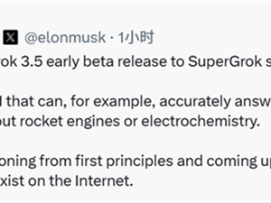 快科技4月29日消息,马斯克刚刚在社交平台X上称,下周将向SuperGrok订阅者推出Grok 3.5,并将该条信息顶置。据马斯克称,Grok 3.5是第一个能够准确回答有关火箭发动机或电化学技术问题的人工智能。同时,Grok可以从第一原理推理并得出互联网上根本不存在的答案。Grok 3.5被马斯克旗下的xAI宣传为全球首个人工智能能从第一性原理推理,生成网络上不存在的答案”。而今年2月18日,xAI正式发布Grok 3,并在两天后把Grok 3免费向所有公众开放,超越ChatGPT,登顶苹果应用商店免费应用下载排行榜第一名。马斯克曾称Grok 3为地球上最聪明的人工智