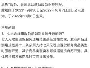 对于这部分商家,闲鱼也要求支持7天无理由退货了...闲鱼发布了关于新增《闲鱼社区七天无理由退货规范》的公示通知,通知显示,此规则于2022年9月30日至2022年10月7日进行公示通知,于2022年10月8日生效...闲鱼列出了卖家可选支持七天无理由退货”产品(例如食品、贴身用品等),以及必须支持七天无理由退货”产品(例如数码产品及配件、图书等)......